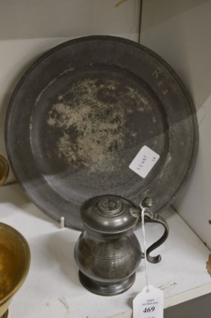 A small pewter lidded tankard or measure and an early pewter dish.