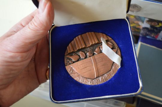 A box of collector coins and medallions.
