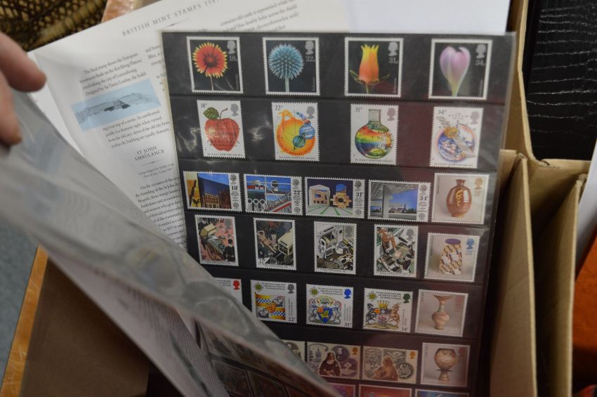 GB stamps, album of 246 pre-decimal stamps 1841-1970, Queen Elizabeth Commemorative stamps 1953-1970 all mint and predominantly mint not hinged, and Beatrix Potter Royal Mail book of stamps, stock card collections of mint 1986 & 1987 GB stamps, stock cards of Australian, Antarctic territory mint stamps.
