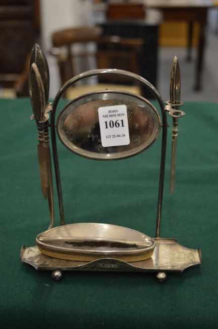A silver manicure set on stand inset with a small mirror (lacking one item).