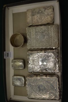 A collection of four silver card cases with engraved decoration, two engraved silver vesta's and a plain serviette ring.