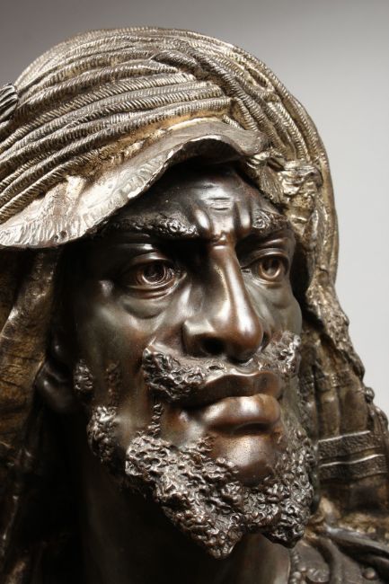 A SUPERB METAL BUST OF AN ARAB with moustache and beard, headdress and cloak, on a square base with claw feet. 30ins high.