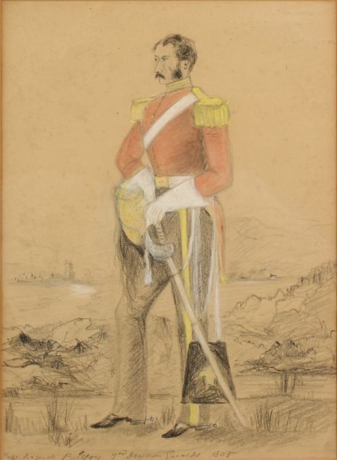 English School, Circa 1845. Captain Bagwell Purefoy, an Officer of the Third Dragoon Guards Standing in a Landscape, Pencil and Wash, 14" x 10".