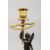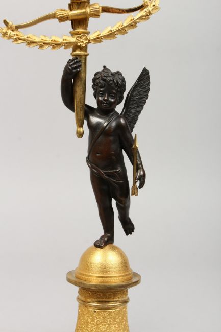 A SUPERB PAIR OF FRENCH EMPIRE BRONZE AND ORMOLU CANDLESTICKS as a pair of winged cupids holding aloft a candle holder and standing on ornate columns with square bases. 13ins high.