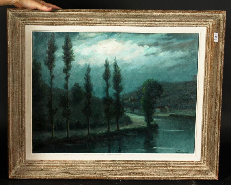 R. Tassoul (20th Century) Continental School. A Tree-Lined River in Moonlight with a Village Beyond, Oil on Canvas, Signed, 18" x 24".