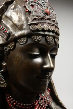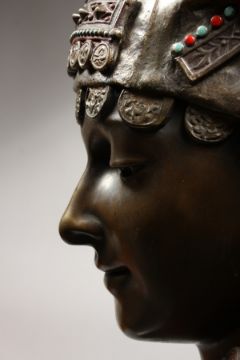 A SUPERB METAL BUST OF AN ARAB PRINCESS with head gear, drop earrings and enamel beadwork jewellery, on a square base with bracket feet. 28ins high.
