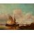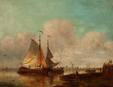 19th Century Dutch School. A Coastal Scene with Moored Vessels and a Windmill Beyond, Oil on Canvas, 7" x 9".