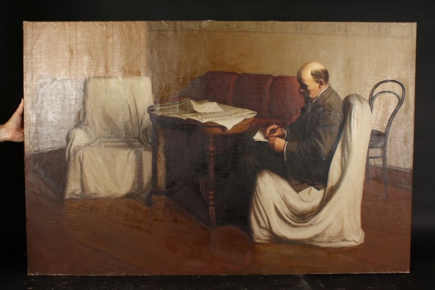 20th Century Russian School. Lenin Seated Making Notes, Oil on Canvas, 35" x 54", Unframed.