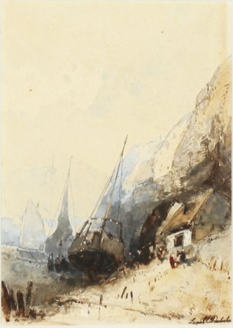 Louis Joseph Legall-Dutertre (b.1796) French. Moored Boats before a Cliff Face, Watercolour, Signed, 5.5" x 3.5".