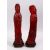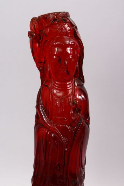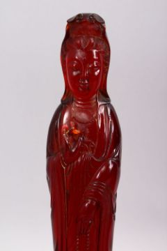 TWO CHINESE CARVED CHERRY AMBER FIGURES OF GUANYIN, both figures stood holding objects, with hardwood pierced stands, 27cm high ( excluding stands ).