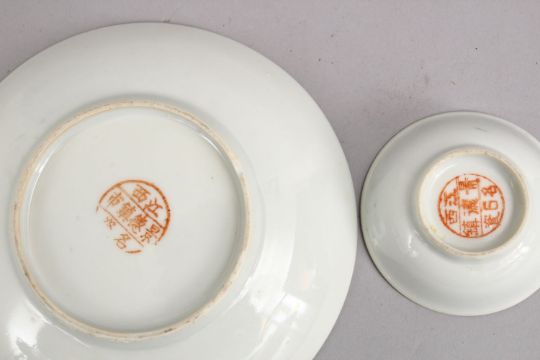 THREE CHINESE TURQUOISE GLAZED PORCELAIN ITEMS, comprising one saucer dish 14cm, one wine cup, 6.5cm, and one small tray, 10cm square, Each decorated with butterflies and flora,
