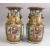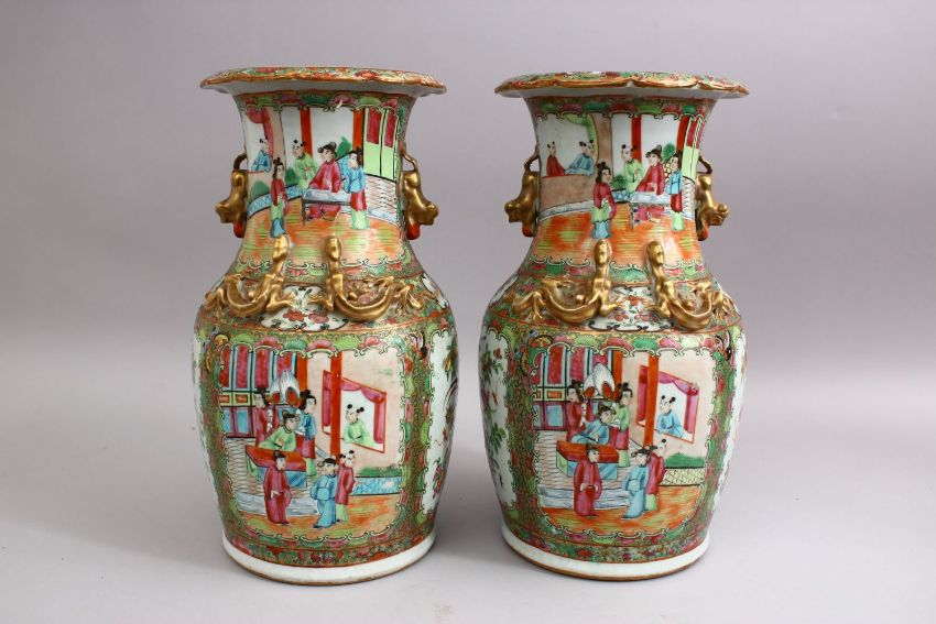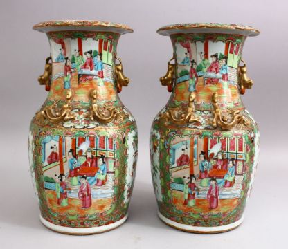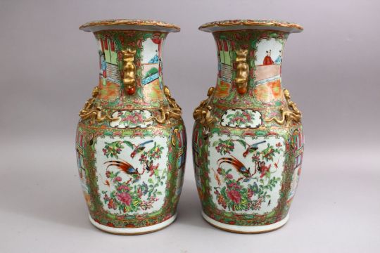A GOOD PAIR OF 19TH CENTURY CHINESE CANTON FAMILLE ROSE PORCELAIN VASES, the body with panel decoration depicting figures in balcony settings and panels of birds amongst flora, further decorated with foliage and butterflies, the sided with twin moulded handles and chilong gilded, 36cm high.