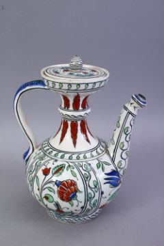 A GOOD TURKISH IZNIK STYLE POTTERY EWER, 22CM HIGH.