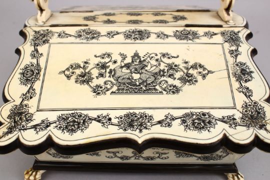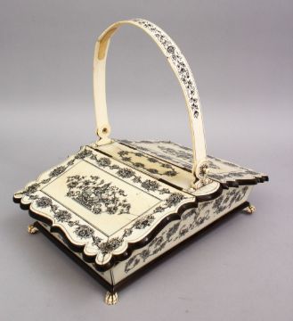 A SUPERB 19TH CENTURY IVORY BASKET, with a pair of shaped flaps, inlaid with gods and flowers, with looped handle on claw feet, 1ft long, 9ins wide.