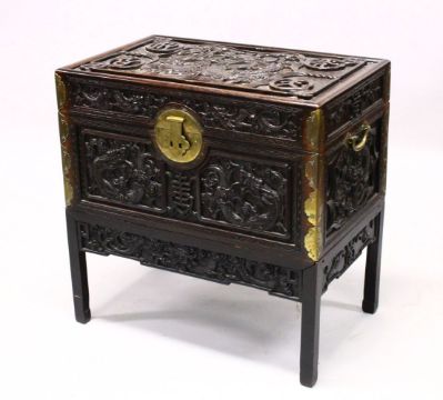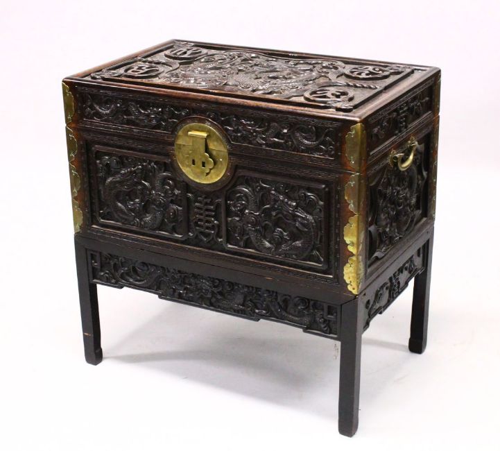 A GOOD 19TH CENTURY CHINESE CARVED HARDWOOD / HONGMU DRAGON CARVED LIDDED CHEST, the panels of the chest carved deeply to depict panels of dragons and bats, stood upon its similarly carved stand, 78cm high x 78cm wide x 48.5cm deep.