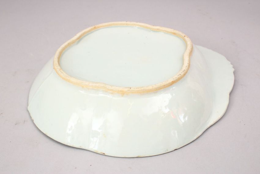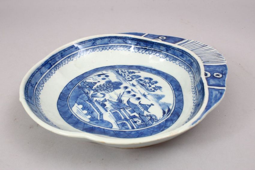 A GOOD 18TH / 19TH CENTURY CHINESE QIANLONG BLUE & WHITE PORCELAIN SHELL DISH, with decoration of lanscapes, 25.5cm x 24cm.