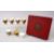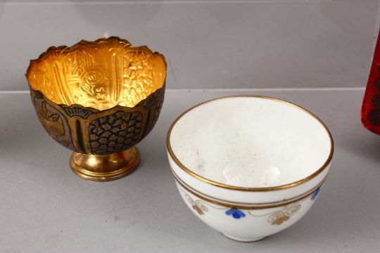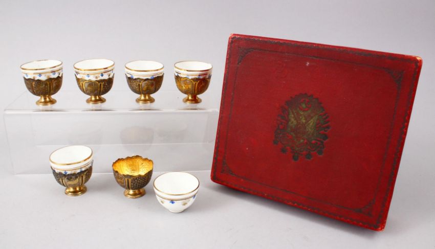 A RARE SET OF 19TH CENTURY TURKISH OTTOMAN WHITE METAL GILT CUPS WITH PORCELAIN LINERS AND ORIGINAL BOX, the white metal embossed with calligraphy and formal scroll, 6cm x 5.5 ( cups and liner ) ,