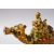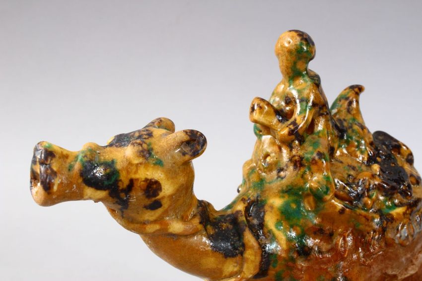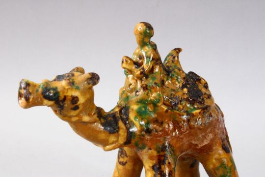 A GOOD TURKISH CANAKKALE POTTERY FIGURE OF A MAN UPON CAMEL BACK, the figure with three colour decoration and the feet unglazed, 19.5cm x 20cm wide.