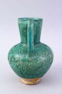 A GOOD EARLY ISLAMIC TURQUOISE GLAZED POTTERY JUG, 22cm high.