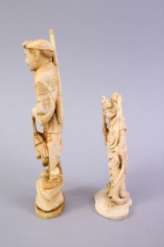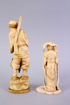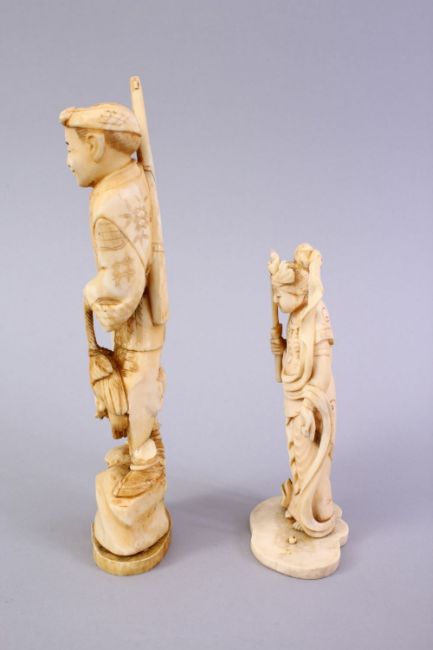TWO JAPANESE MEIJI PERIOD CARVED IVORY OKIMONOS, one of a hunter holding his catch, 21cm high, the other of as goddess holding a staff, signed to base, 14cm