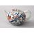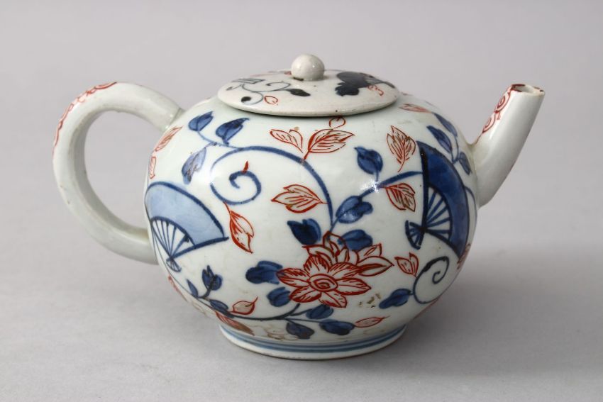 A GOOD 19TH CENTURY CHINESE IMARI PORCELAIN TEAPOT & COVER, decorated ith underglaze blue decoration with fans and foliage with iron red decor of leaves, 8cm high x 16cm wide.