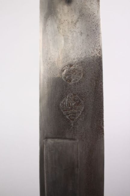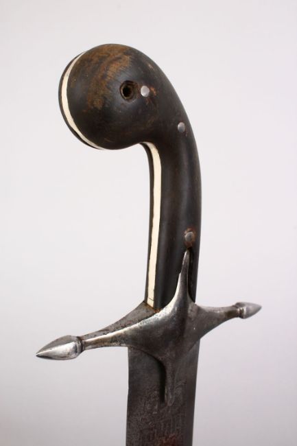 A 19TH CENTURY TURKISH OTTOMAN RHINO HORN HILTED SWORD WITH CALLIGRAPHIC SIGNED BLADE, 85cm.