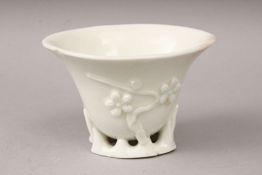 A 19TH CENTURY CHINESE BLANC DE CHINE PORCELAIN LIBATION CUP, with moulded relief decoration depicting blossom, 6cm high x 9cm wide.