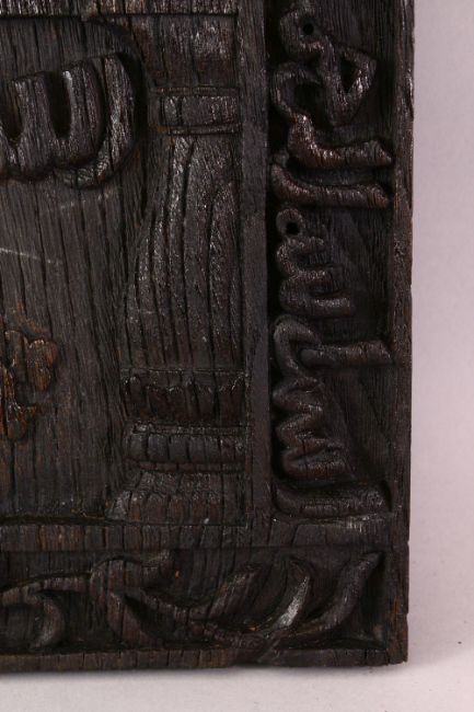 A GOOD 19TH CENTURY OR EARLIER IRANIAN MIRIHAB CARVED WOODEN PANEL, carved with calligraphy and a central suspention, 50cm x 32cm.