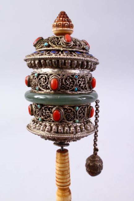 A GOOD 19TH CENTURY TIBETAN WHITE METAL AND INLAID PRAYER WHEEL, the wheel with filigree style metal work with inlaid turquoise and coral, with a green jade band aroundd the centre with a bone handle, the interior contain the original manuscripts, 24cm high,