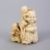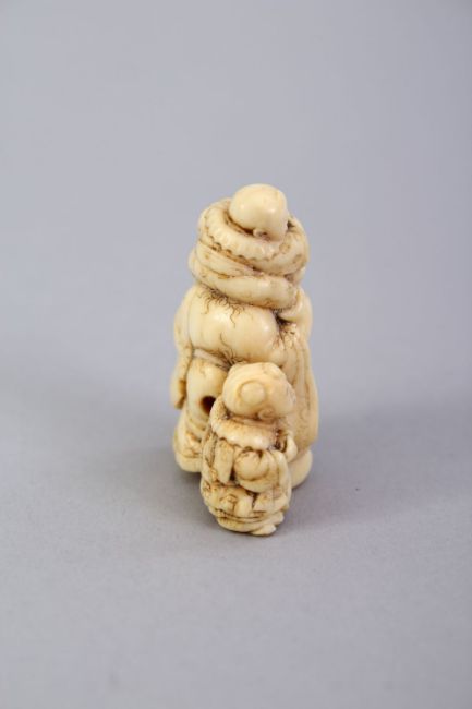A JAPANESE MEIJI PERIOD CARVED IVORY NETSUKE OF HOTEI, stood with a young boy upon his back and another to his side eating a biscuit, artist signed to base, himotoshi formed to reverse, 4cm.