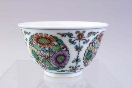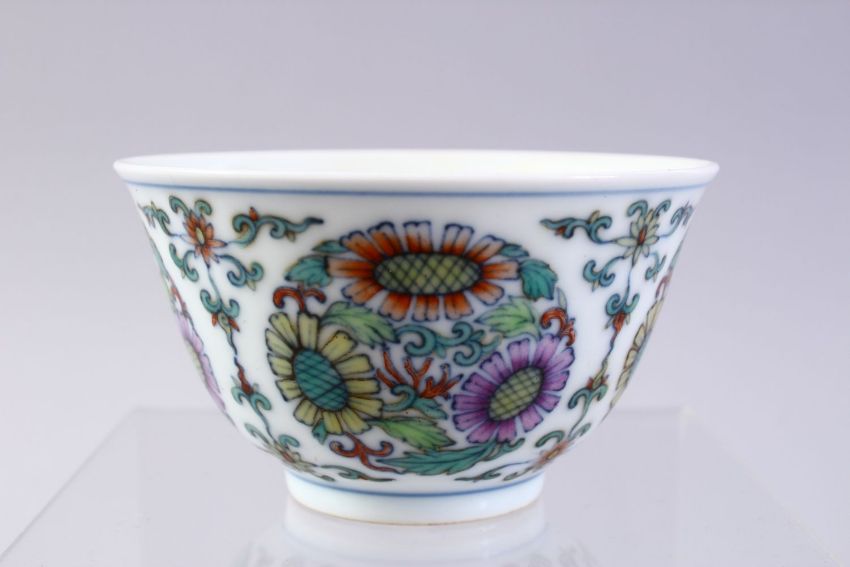 A CHINESE DOUCAI DECORATED CHRYSANTHEMUM PORCELAIN CUP, decorated with roundels of floral displays, the base bearing a six character mark, 8cm.