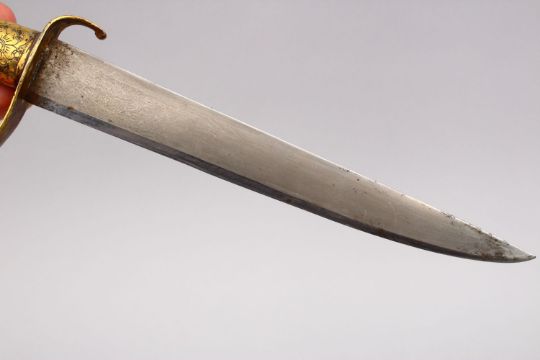 A FINE INDIAN GILT METAL DAGGER WITH WATERED STEEL BLADE, with floral carved sheath and hilt, 30cm.