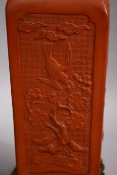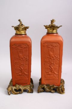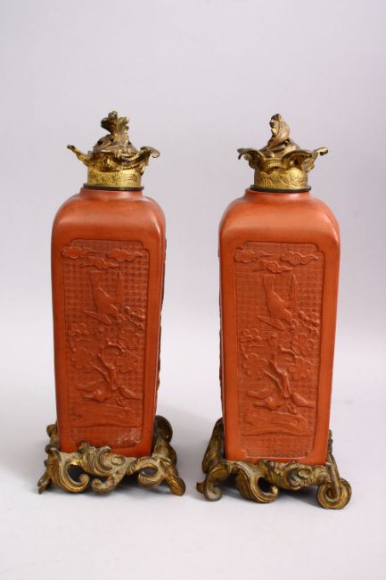 A GOOD PAIR OF CHINESE YIXING CLAY VASES AS LAMPS, the vases converted to lamps with ormolu mounts, the body of the vases with native floral scenes with birds, 31cm high.
