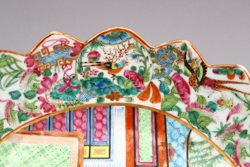 A 19TH CENTURY CHINESE CANTON FAMILLE ROSE PORCELAIN LOBED BOWL, the body of the bowl with panel decoration of figures in garden settings, surrounded with borders of birds and flora, 26cm. (af)
