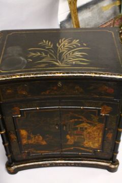 A PAIR OF 19TH CENTURY CHINOISERIE LACQUERED SIDE CABINETS, with bamboo formed side rails, the panels decorated with native village / landscape scenes, 68cm high x 65cm wide