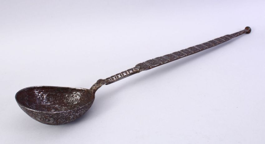 A 12TH/13TH CENTURY PERSIAN SELJUK ENGRAVED IRON LADLE, with foliate and figural decoration, 48cm long.