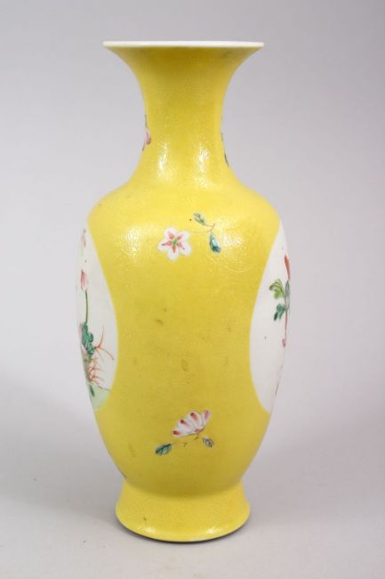 A CHINESE REPUBLIC STYLE YELLOW GROUND FAMILLE JAUNE PORCELAIN VASE, with panel decoration of flora and butterflies, with an incised ground, the base with an iron red seal mark. 24.5cm high.