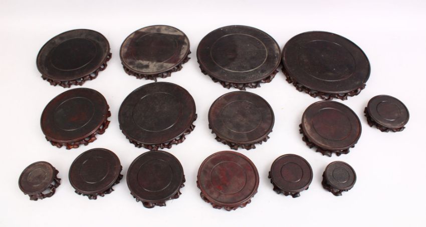 A MIXED LOT OF 19TH CENTURY CHINESE CARVED HARDWOOD STANDS, comprising of fifteen various shaped and sized stands, (15)