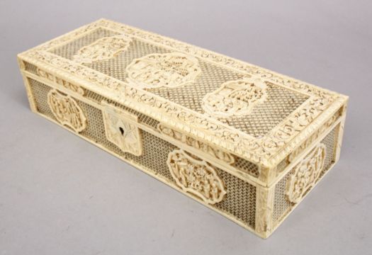 A FINE QUALITY 19TH CENTURY CHINESE CANTON CARVED IVORY OPENWORK LIDDED BOX, the box with openwork and carved panels depicting figures in landscapes with buildings, 24.5cm wide x 9.5cm deep x 5.5cm high.