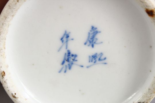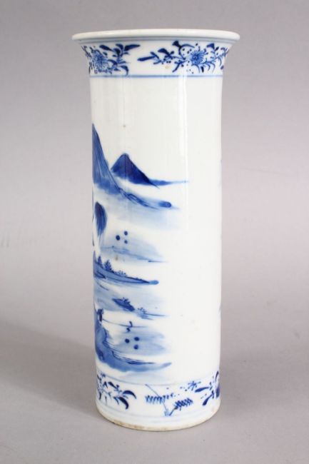 A GOOD 19TH CENTURY CHINESE BLUE & WHITE PORCELAIN SLEEVE VASE, the body of the vase decorated with the scenes of a mountain and landscape, the base with a four character mark, 20cm.,