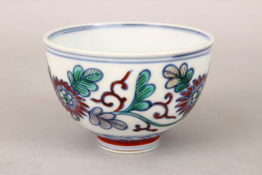 A 19TH CENTURY CHINESE DOUCAI PORCELAIN TEA CUP, decorated interior with blue and white floral pattern, the exterior with colourful floral displays and geometric borders, the base bearing a four character mark, 6.2cm high x 9.5cm diameter