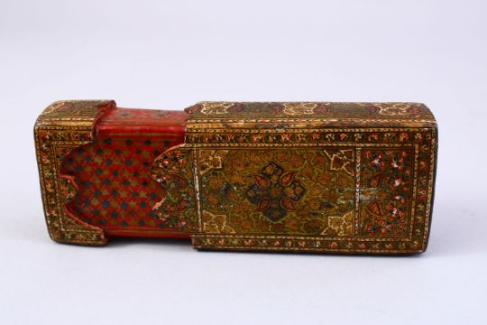 A 19TH CENTURY INDO PERSIAN KASHMIRI PAPIER MACHE LACQUERED SLIDING BOX, 13cm long.