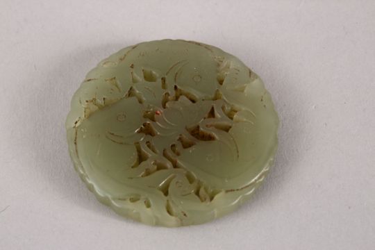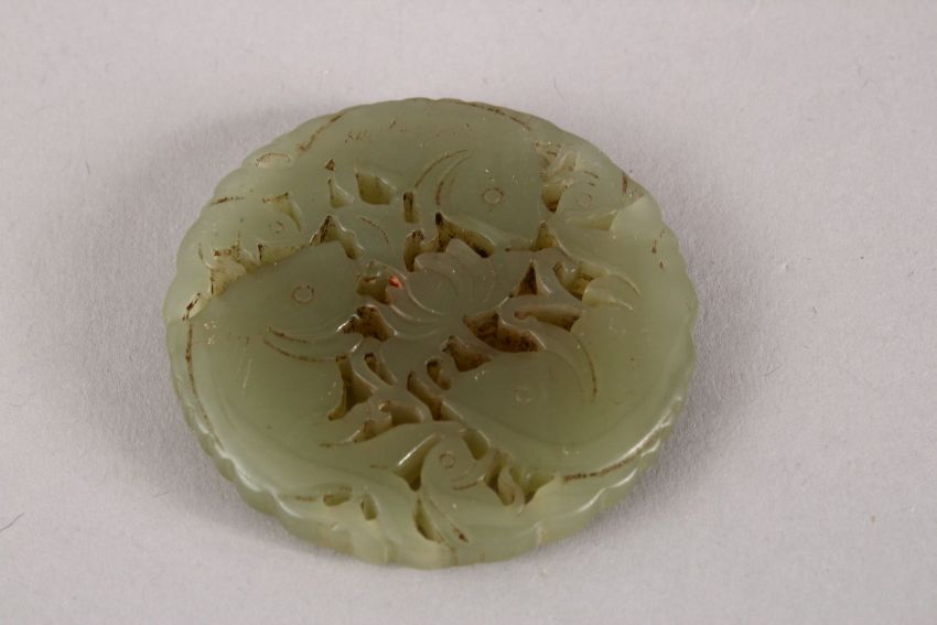 A GOOD 19TH / 20TH CENTURY CHINESE CARVED GREEN JADE FISH PENDANT, six fish continuously swimming around flora, 5cm