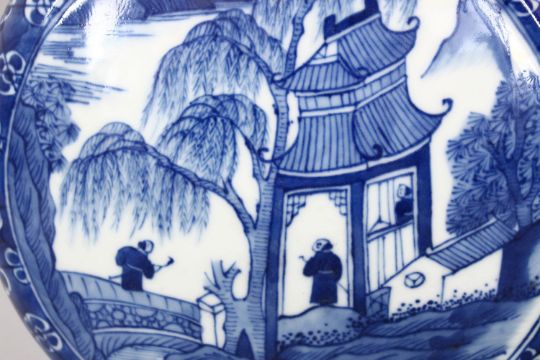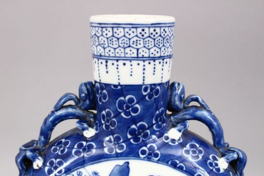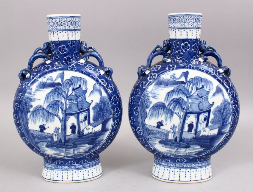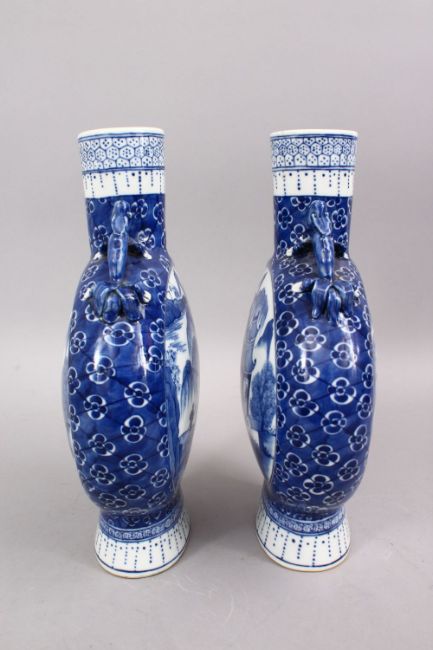 A GOOD PAIR OF 18TH / 19TH CENTURY CHINESE BLUE & WHITE PORCELAIN MOON FLASK VASES, both decorated with scenes of figures at waterside setting, twin moulded handles, the base with four character kangxi marks 30cm high.