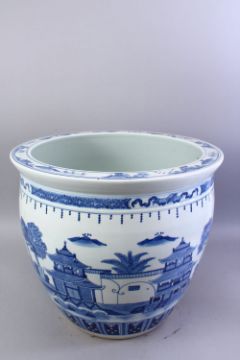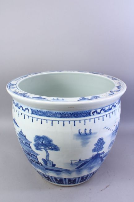 A LARGE CHINESE BLUE & WHITE PORCELAIN JARDINIERE, decorated with scenes of native landscape scenes, and figures on boats, 41.5cm high x 46.5cm diameter.