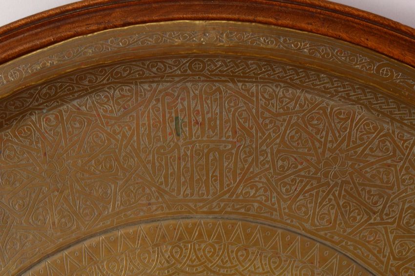A LARGE ISLAMIC BRASS CIRCULAR TRAY WITH HARDWOOD MOUNT, WITH KUFIC CALLIGRAPHY, 77cm.