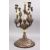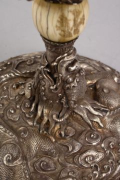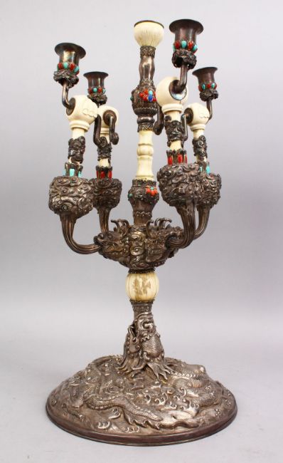 A FINE QUALITY 19TH CENTURY CHINESE SOLID SILVER, IVORY AND PRECIOUS STONE CANDELABRA, the stick with a circular dragon carved base, the mouth of the dragon holding a carved ivory finial attaching the five main arms, each arm with an ivory carved masonic fist, and inlaid with semio precious stones including turquoise and coral, 53cm high x 27cm diameter.