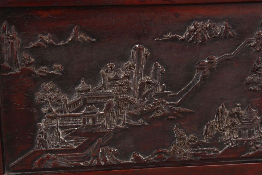 TWO 19TH CENTURY CHINESE CARVED HARD WOOD STANDS, both stands carved depicting native landscape scenes, both of scroll end form, 30 & 27cm wide.