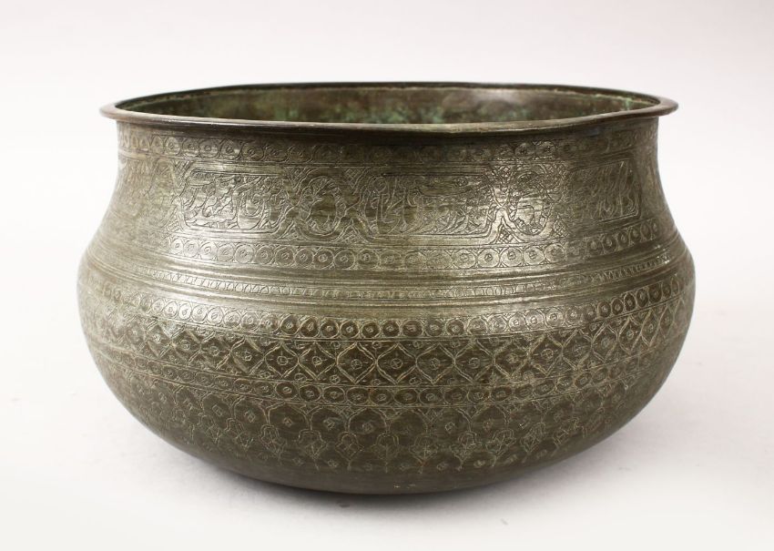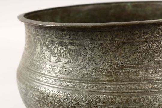 A LATE 19TH CENTURY PERSIAN COPPER CALLIGRAPHIC BOWL , with panel decoration of calligraphy, formal flora and animals, 16cm high x 26.5cm diameter,