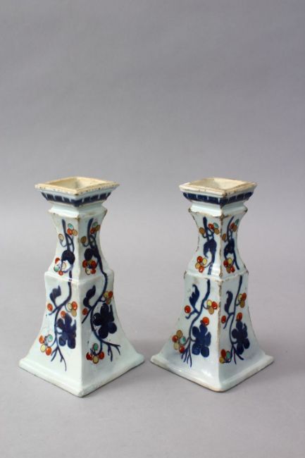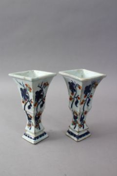 A GOOD PAIR OF 18TH CENTURY QIANLONG CHINESE IMARI DECORATED PORCELAIN PRONK VASES, decor after cornilius pronk, 17.5cm high. (AF)